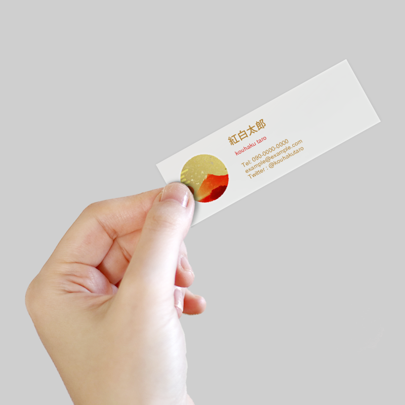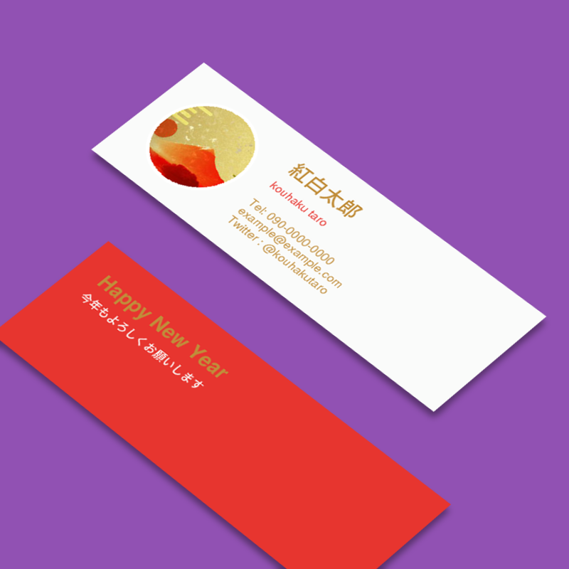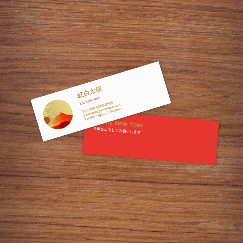 表面、裏面で紅白を表現、文字色は金をイメージしたおめでたい色合いのデザインです。