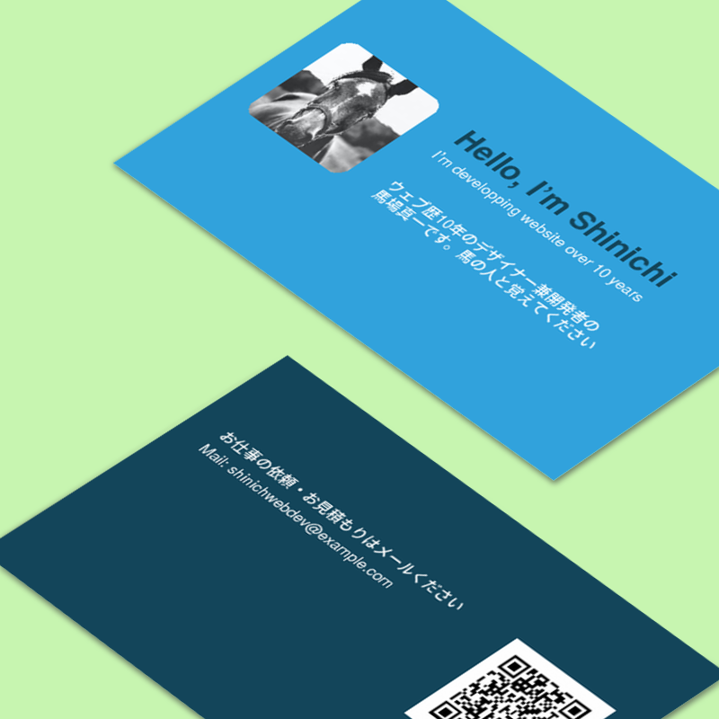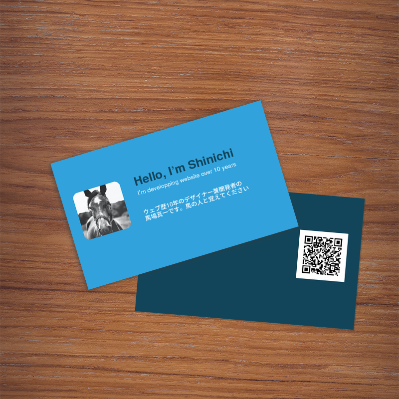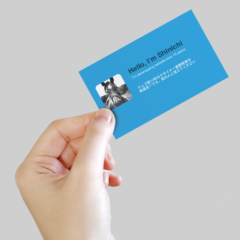 アイコンをモノクロにすることでクールにまとまります。ブルーも2色に絞って、白抜き文字を映えさせてます。インパクトのある馬の写真で次に会った時にも「あ、馬の人!」と覚えていてもらえるかもしれません。